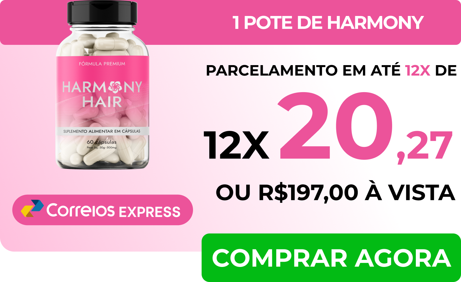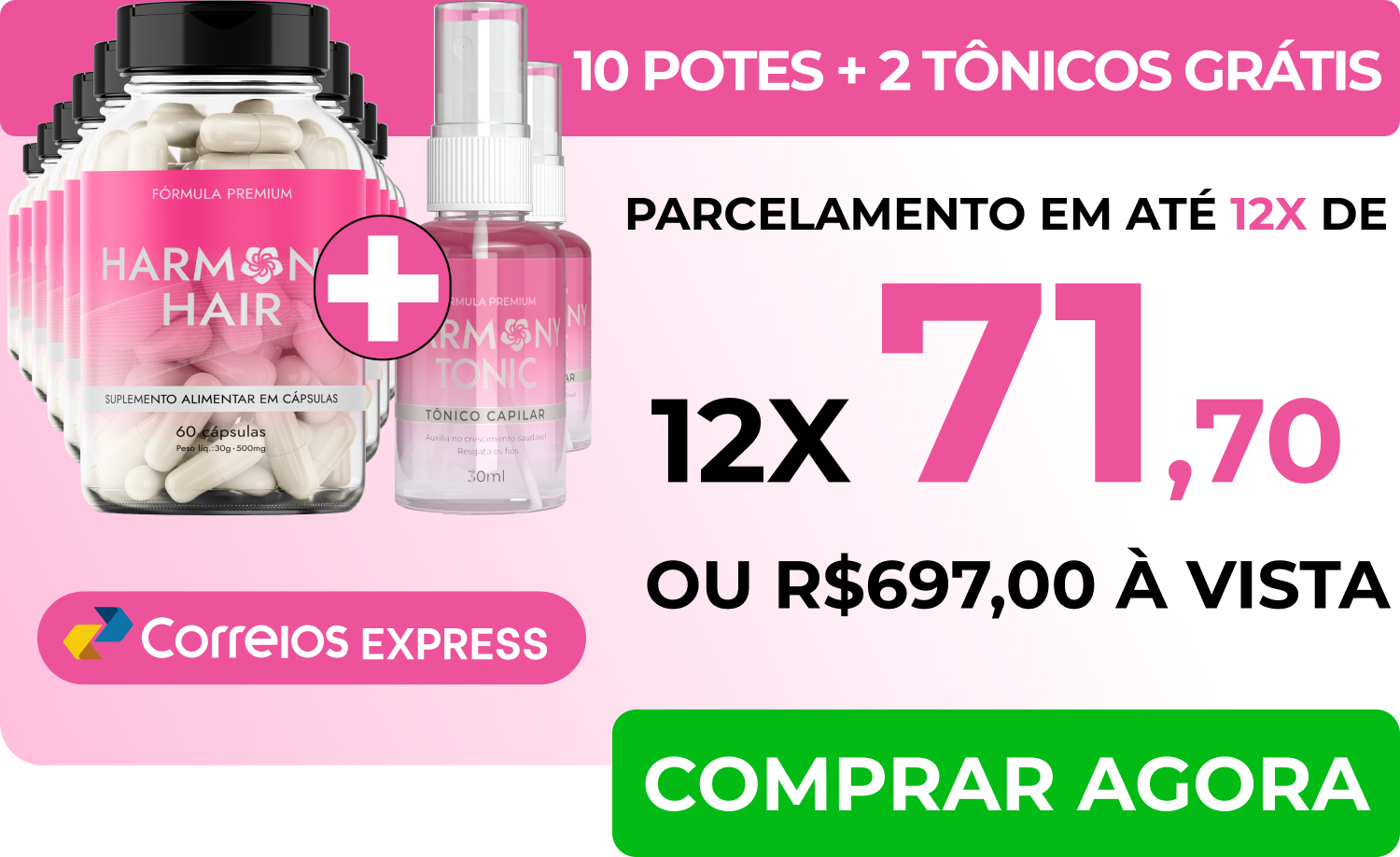 Basta escolher o kit que mais combina com você. Harmony Hair pode ser pago a vista, através de boleto bancario, pix ou através de cartão de crédito parcelado em até 12x.
